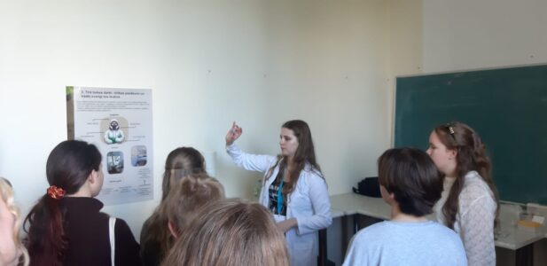 Liepājas Raiņa vidusskolas skolēniem, kas padziļināti apgūst bioloģiju, bija iespēja iepazīt kā noris pētniecības procesi, kā arī uzzināt par nākotnes karjeras iespējām saistībā ar bioloģiju dažādās molekulārās bioloģijas jomā. Cita starpā jaunieši noklausījās stāstījumu par arheoloģisko DNS un tās izpētes iespējām “Seno Latvijas teritorijas iedzīvotāju ģenētiskā izpēte, izmantojot arheoloģisko kaulu materiālu” (A.Pokšāne, J.Ķimsis)